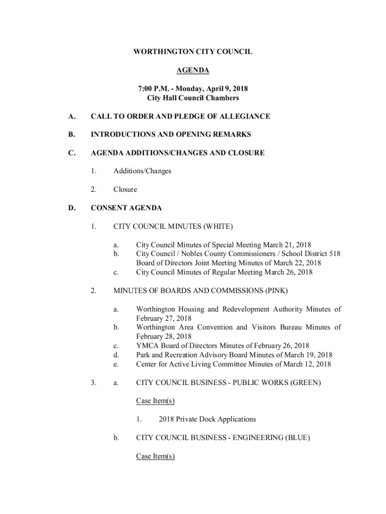WORTHINGTON CITY COUNCIL AGENDA 7:00 P.M. Monday, April 9, 2018, City Hall Council Chambers A.CALL TO ORDER AND PLEDGE OF ALLEGIANCE.INTRODUCTIONS AND OPENING REMARKS.AGENDA ADDITIONS/CHANGES AND