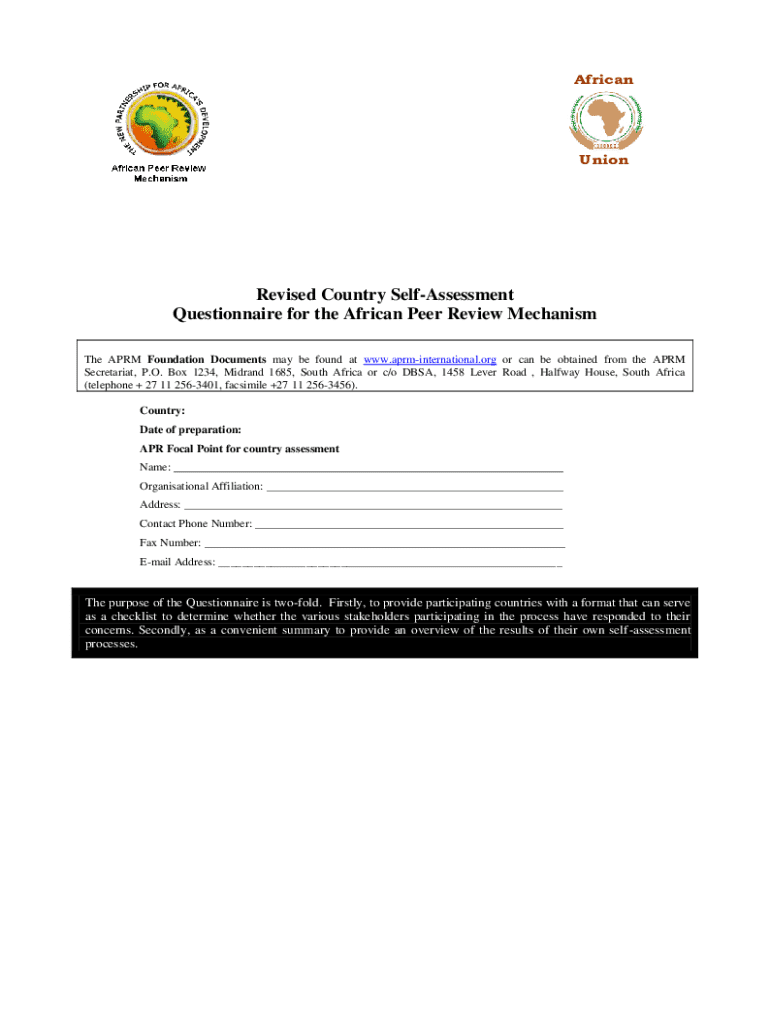 AfricanUnionRevised Country SelfAssessment Questionnaire for the African Peer Review Mechanism The APRM Foundation Documents may be found at www.aprminternational.org or can be obtained from the APRM