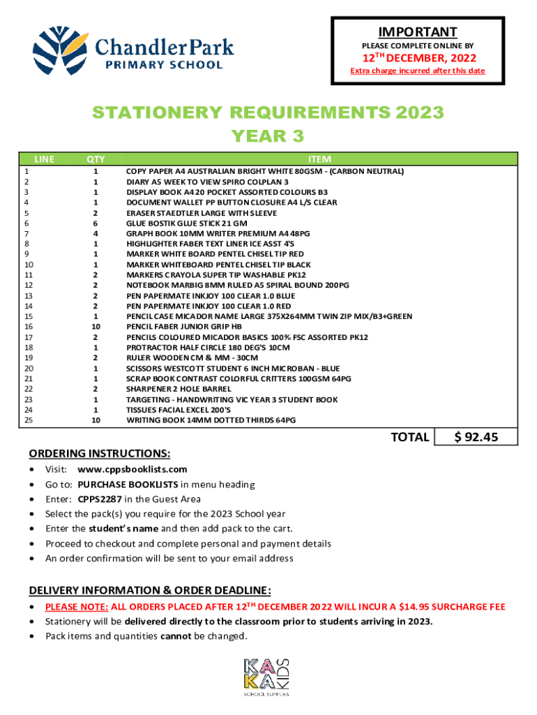 IMPORTANTPLEASE COMPLETE ONLINE BY12TH DECEMBER, 2022Extra charge incurred after this dateSTATIONERY REQUIREMENTS 2023