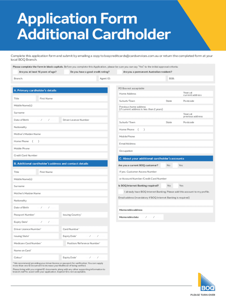 Application Form Additional Cardholder Complete this application form and submit by emailing a copy to boqcreditcards@cardservices.com.au or return the completed form at your local BOX Branch. Please