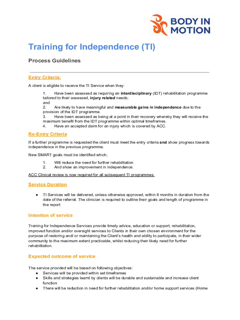 Training for Independence (TI) Process Guidelines Entry Criteria: A client is eligible to receive the TI Service when they: 1. Have been assessed as requiring an interdisciplinary (IDT) rehabilitation