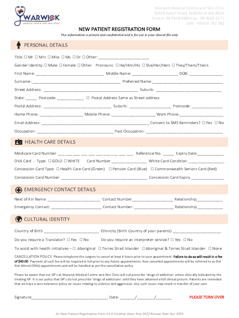 Warwick Medical Center and Skin Clinic 8/639 Beach Road, WARWICK WA 6024 Phone: 08 9448 9880 Fax: 08 9463 6277 ABN : 49 658 782 382NEW PATIENT REGISTRATION From This information is private and confidential