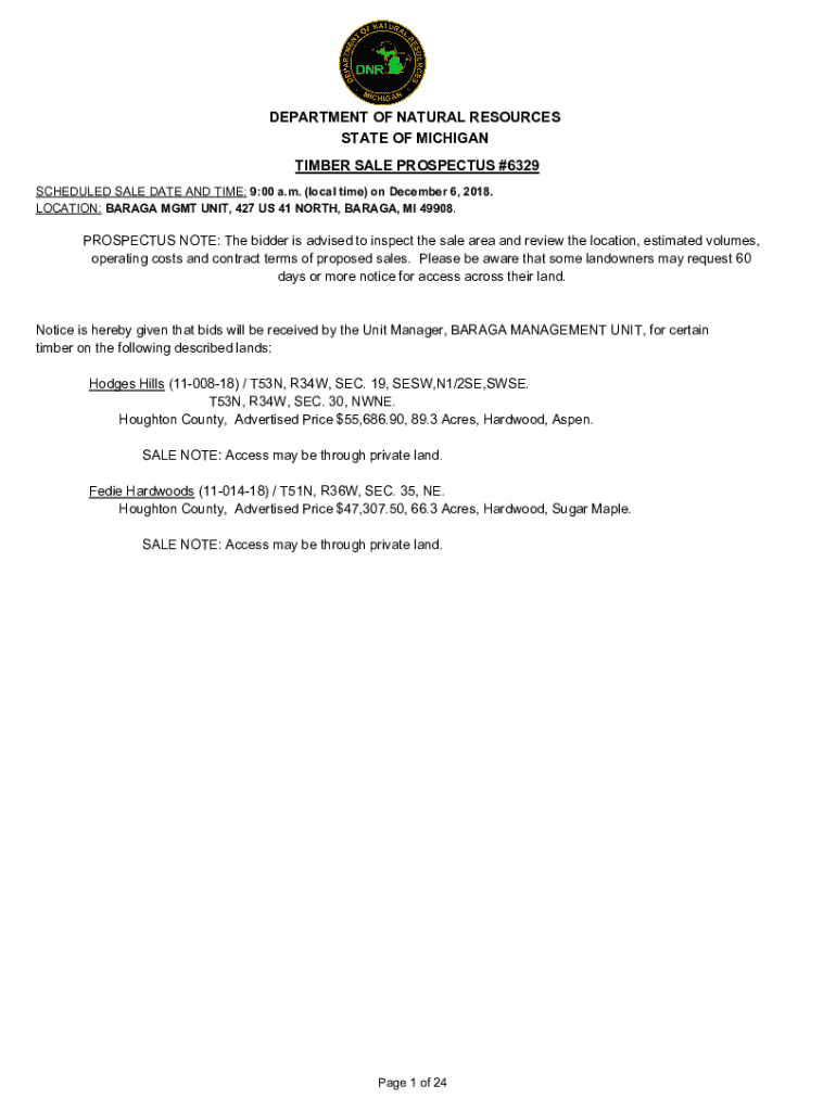 Timber Sale Prospectus #6329 for the Hodges Hills (11-008-18) and FEDIS Hardwoods (11-014-18) timber sales in the Ba raga Management Unit, Houghton County, Michigan. The prospectus provides information on the sale location, estimated volumes, operating costs, contract terms, bid instructions, and payment schedules. Bidders must submit sealed bids for each species and product at or above the advertised price. Access to the sale area may be through private land. The winning bidder must provide...