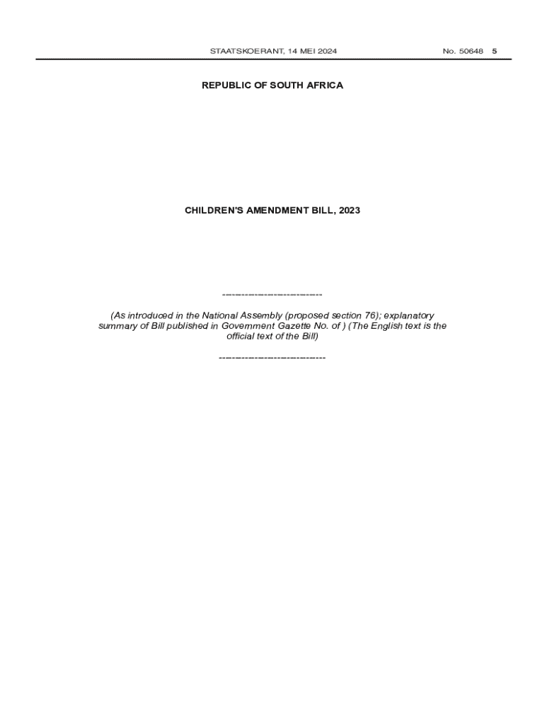 The Children\'s Amendment Bill, 2023 aims to amend the Children\'s Act, 2005, to provide for the requirements of a strategy concerning early childhood development, the collection of data on early childhood development, funding of early childhood development programs, the specification of norms and standards for early childhood development programs, measures relating to registration and conditional registration, and roles and responsibilities of organs of state and different spheres of...