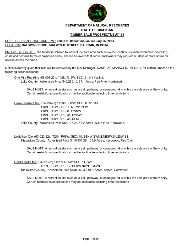 DEPARTMENT OF NATURAL RESOURCES STATE OF MICHIGAN TIMBER SALE PROSPECTUS #7151 SCHEDULED SALE DATE AND TIME: 3:00 p.m. (local time) on January 25, 2023. LOCATION: BALDWIN OFFICE, 2468 W 24TH STREET,