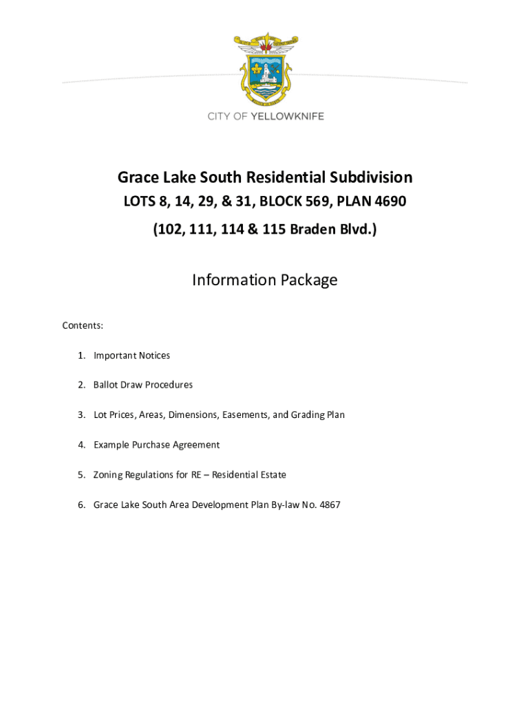 Grace Lake South Residential Subdivision LOTS 8, 14, 29, & 31, BLOCK 569, PLAN 4690 (102, 111, 114 & 115 Braden Blvd.)Information Package Contents: 1. Important Notices 2. Ballot Draw Procedures 3.