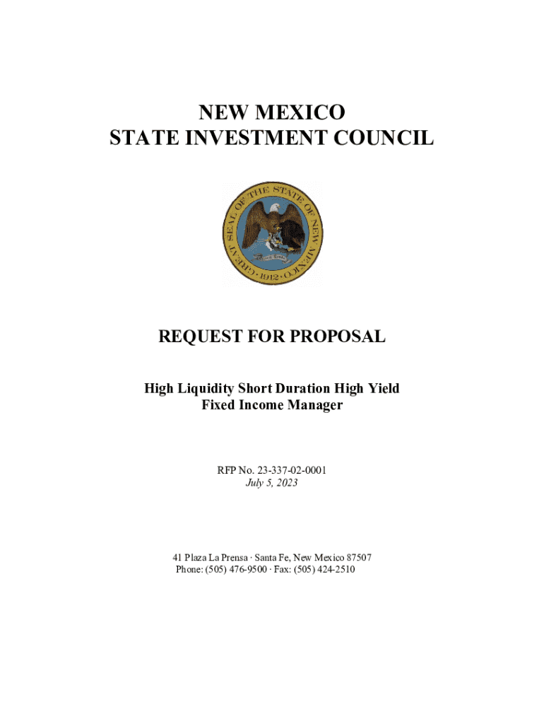 NEW MEXICO STATE INVESTMENT COUNCILREQUEST FOR PROPOSAL High Liquidity Short Duration High Yield Fixed Income ManagerRFP No. 23337020001 July 5, 202341 Plaza La Prensa Santa Fe, New Mexico 87507 Phone: