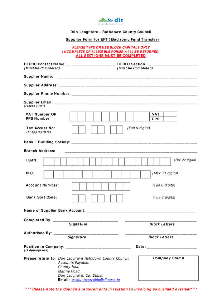 Dn Laoghaire Rathdown County Council Supplier Form for EFT (Electronic Fund Transfer) PLEASE TYPE OR USE BLOCK CAPITALS ONLY INCOMPLETE OR ILLEGIBLE FORMS WILL BE RETURNEDALL SECTIONS MUST BE COMPLETED