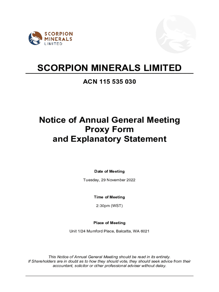 SCORPION MINERALS LIMITED ACN 115 535 030Notice of Annual General Meeting Proxy Form and Explanatory StatementDate of Meeting Tuesday, 29 November 2022Time of Meeting 2:30pm (WST)Place of Meeting