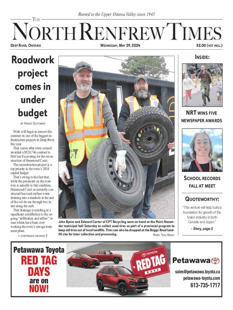 Rooted in the Upper Ottawa Valley since 1945THENORTH RENFREW TIMESDEEP RIVER, ONTARIOWEDNESDAY, MAY 29, 2024$2.00 (HST INCL.)INSIDE:Roadwork project comes in under budget BY VANCENRT WINS FIVE NEWSPAPER