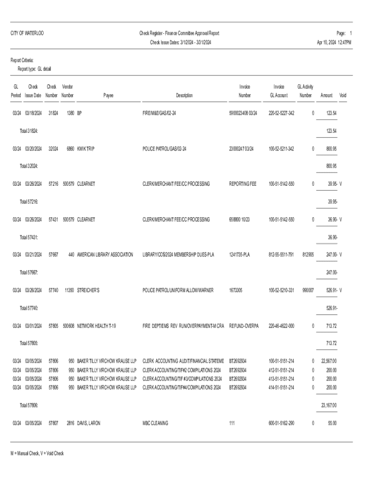 CITY OF WATERLOOCheck Register Finance Committee Approval ReportPage:Check Issue Dates: 3/1/2024 3/31/2024 Report Criteria: Report type: GL detail GLCheckCheckVendorPeriodIssue DateNumberNumber03/2403/18/202431824Payee1380