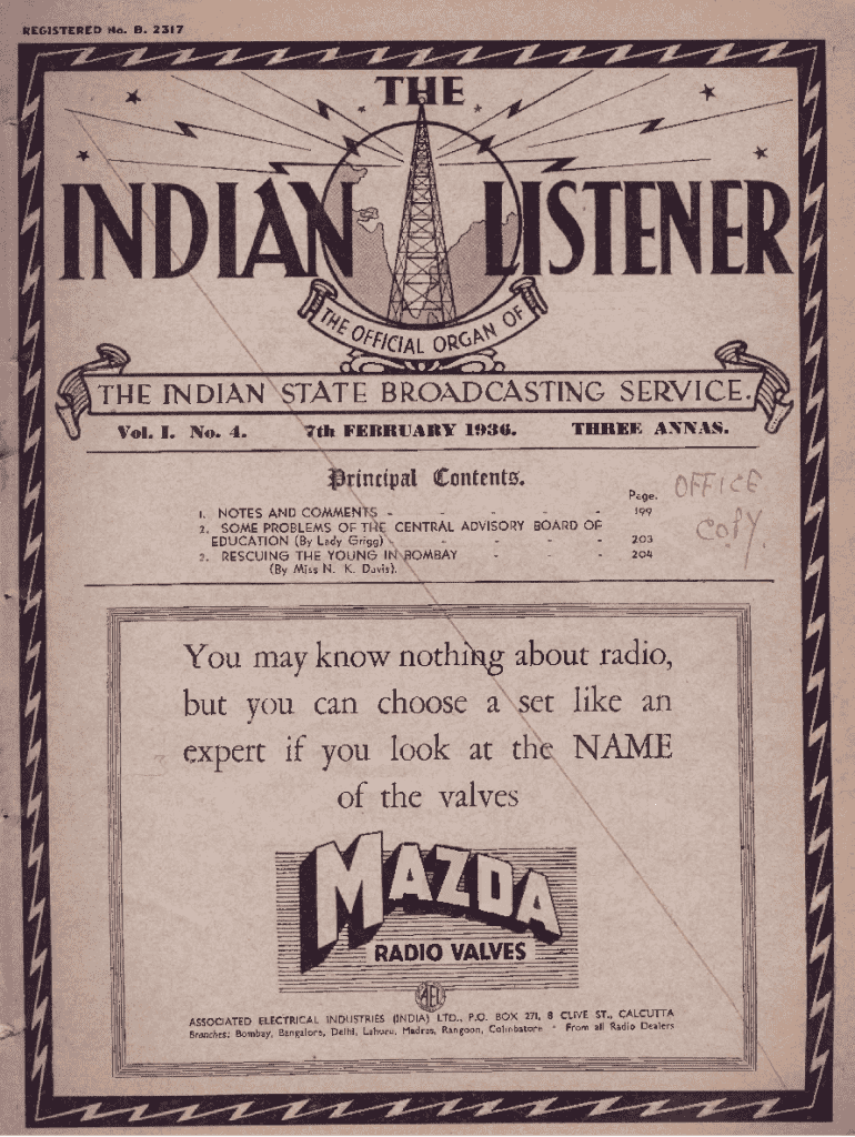 REGISTERED 317 R E G I S T E R E D HHo. o. B. B . 22 3 17TE^ i6lat ./ger\'.rWRV`vsiISTENERTHE STATE BROADCASTING BROADCASTING SERVICE SERVICE THE INDIAN INDIAN STATE THREE ANNAS. A N N A S. F E B