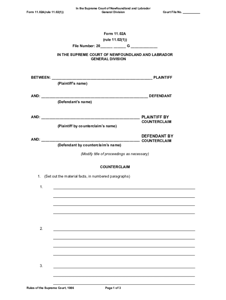 In the Supreme Court of Newfoundland and Labrador General DivisionForm 11.02A(rule 11.02(1))Court File No. Form 11.02A (rule 11.02(1)) File Number: 20___ ___ G ___ IN THE SUPREME COURT OF NEWFOUNDLAND