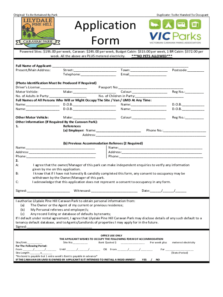 Original: To Be Retained By ParkDuplicate: To Be Handed To OccupantApplication Form Powered Sites: $195.00 per week, Caravan: $245.00 per week, Budget Cabin: $315.00 per week, 1 BR Cabin: $372.00