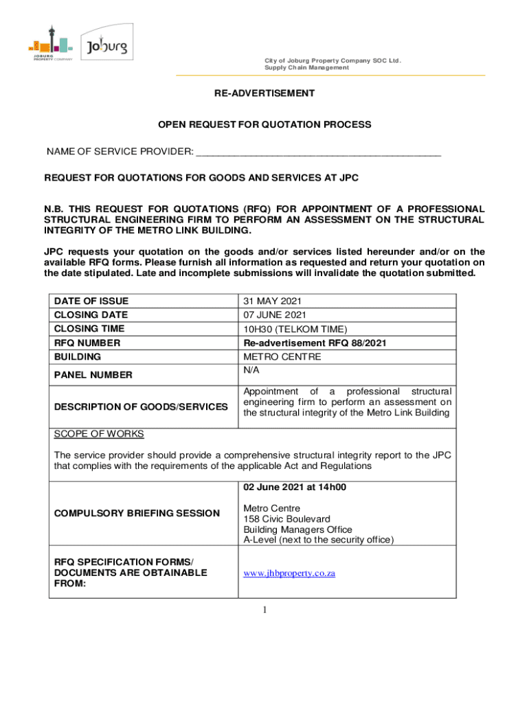 City of Jo burg Property Company SOC Ltd. Supply Chain ManagementREADVERTISEMENTOPEN REQUEST FOR QUOTATION PROCESS NAME OF SERVICE PROVIDER: ___ REQUEST FOR QUOTATIONS FOR GOODS AND SERVICES AT JPN.