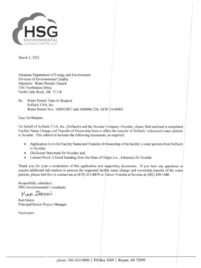 HSGENVIRON MENTAL CONSULTANTS. LLCMarch 3, 2023ArkansasDepartmentofEnergy and QualityIEnvironmentDivision of EnvironmentalAttention: Water Permits Branch 5301 Northshore DriveNorth Little Re:Rock,AR