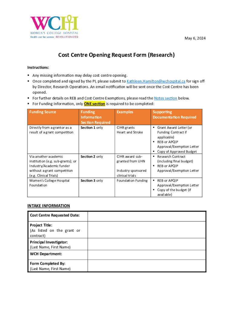 May 6, 2024Cost Center Opening Request Form (Research) Instructions: Any missing information may delay cost center opening. Once completed and signed by the PI, please submit to Kathleen.Hamilton@wchospital.ca