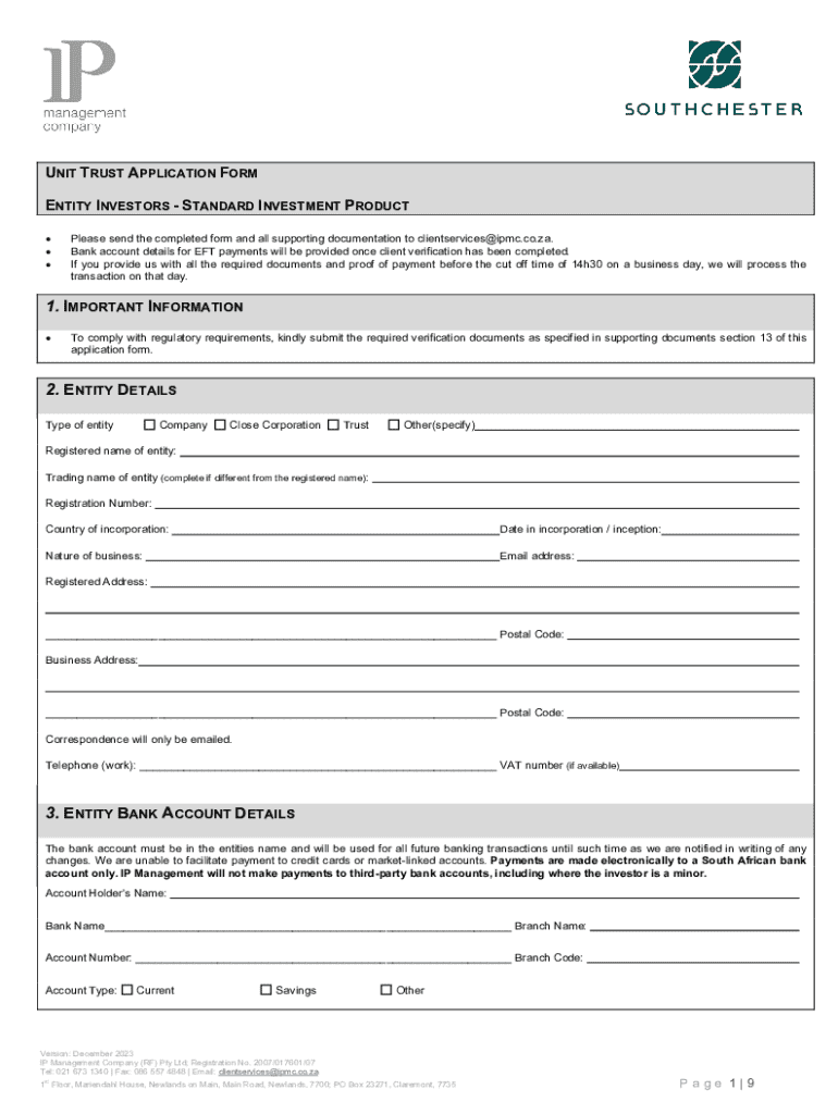 UNIT TRUST APPLICATION FORM ENTITY INVESTORS STANDARD INVESTMENT PRODUCT Please send the completed form and all supporting documentation to clientservices@ipmc.co.za. Bank account details for EFT