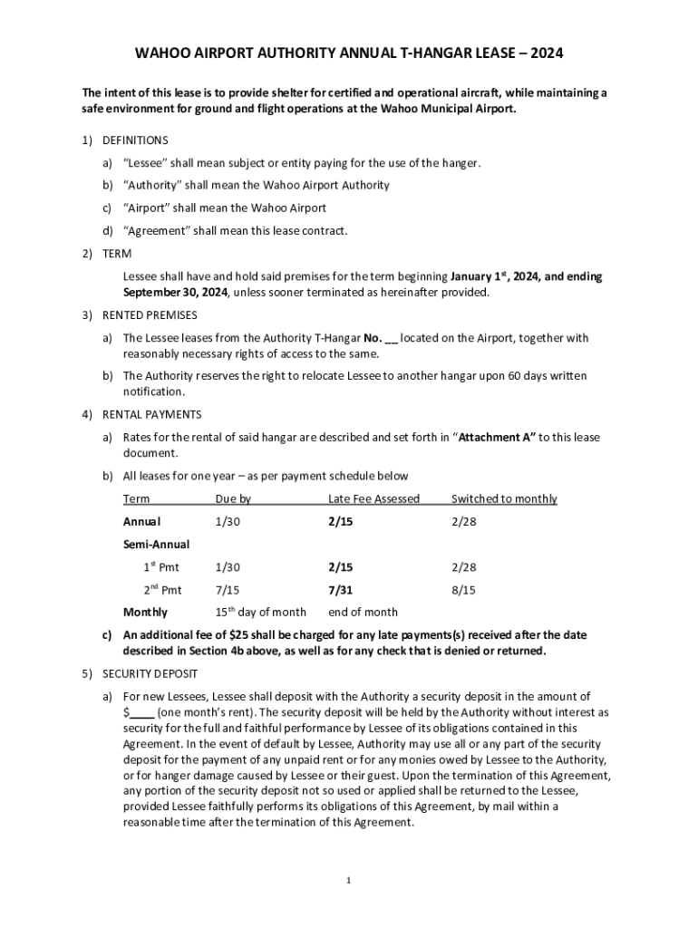 YAHOO AIRPORT AUTHORITY ANNUAL HANGAR LEASE 2024 The intent of this lease is to provide shelter for certified and operational aircraft, while maintaining a safe environment for ground and flight operations