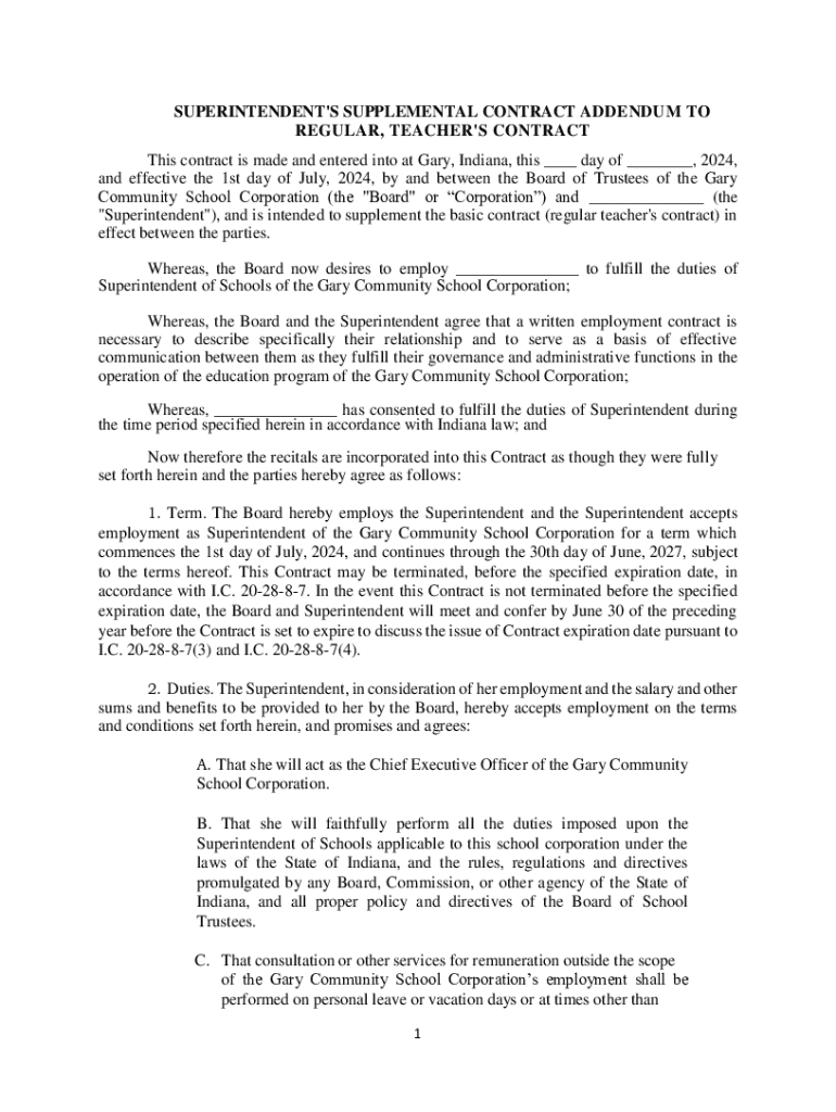 SUPERINTENDENT\'S SUPPLEMENTAL CONTRACT ADDENDUM TO REGULAR, TEACHER\'S CONTRACT This contract is made and entered into at Gary, Indiana, this ___ day of ___, 2024, and effective the 1st day of July