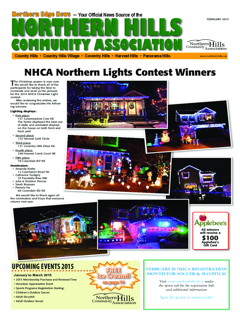 Northern Edge News Your Official News Source of theFEBRUARY 2015NORTHERN EDGE NEWSFEBRUARY 2015NorthernHillsCommunityAssociationCountry Hills Country Hills Village Coventry Hills Harvest Hills Panorama Hillswww.northernhills.caNHCA Northern Lights Contest Winners The Christmas season is now over. We would like to thank all of the participants for taking the time to nominate and send us the pictures for the 2014 NHCA Christmas Light contest. After reviewing