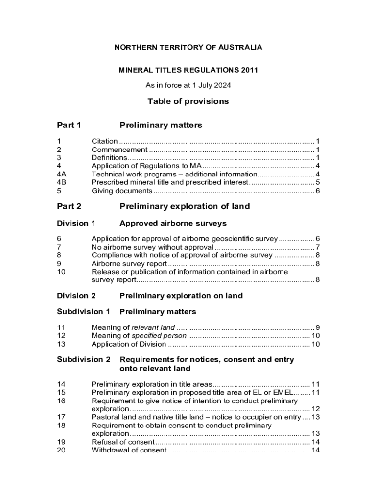 NORTHERN TERRITORY OF AUSTRALIA MINERAL TITLES REGULATIONS 2011 As in force at 1 July 2024Table of provisions Preliminary afterpart 1 1 2 3 4 4A 4B 5Citation ............................................................................................