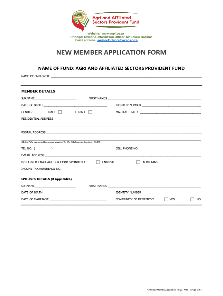 Website: www.aspf.co.za Principal Officer & Information Officer: Mr Laurie Bowman Email address: agrisectorfund@verso.co.zaNEW MEMBER APPLICATION FORM NAME OF FUND: AGRA AND AFFILIATED SECTORS PROVIDENT