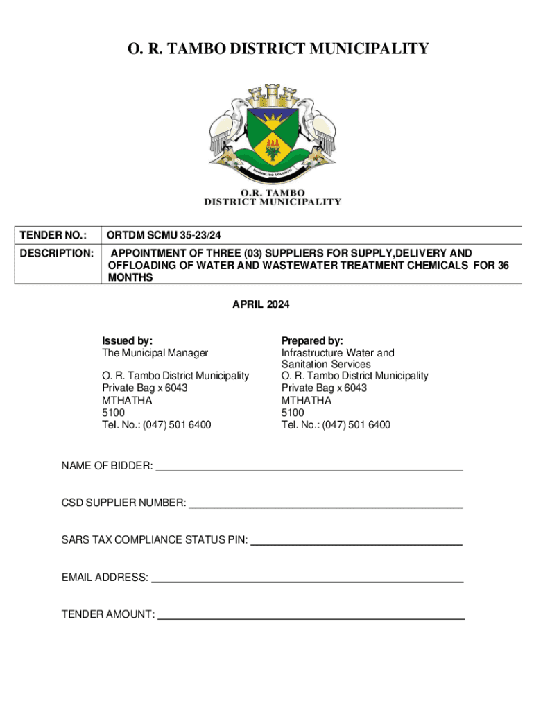 O. R. RAMBO DISTRICT MUNICIPALITYTENDER NO.:OR TDM CMU 3523/24DESCRIPTION:APPOINTMENT OF THREE (03) SUPPLIERS FOR SUPPLY, DELIVERY AND OFFLOADING OF WATER AND WASTEWATER TREATMENT CHEMICALS FOR 36