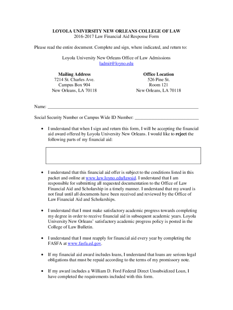 LOYOLA UNIVERSITY NEW ORLEANS COLLEGE OF LAW 20162017 Law Financial Aid Response Form Please read the entire document. Complete and sign, where indicated, and return to: Loyola University New Orleans