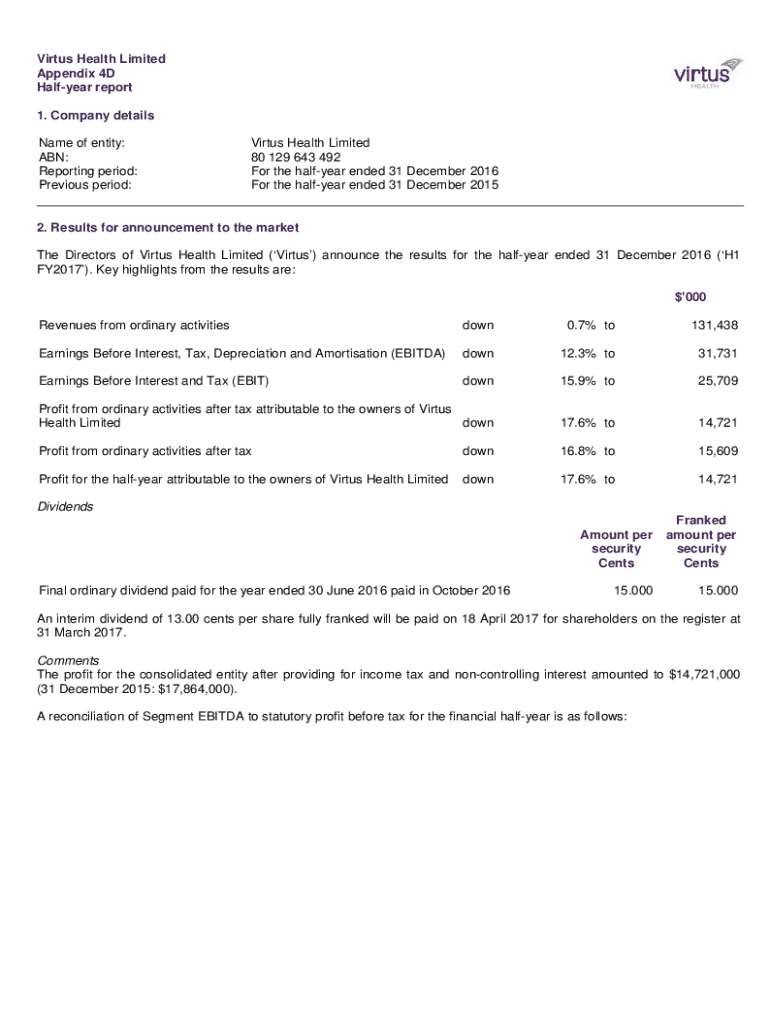 Virus Health Limited Appendix 4D Half year report 1. Company details Name of entity: ABN: Reporting period: Previous period:Virus Health Limited 80 129 643 492 For the half year ended 31 December