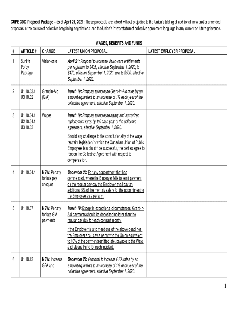 CUP 3903 Proposal Package as of April 21, 2021: These proposals are tabled without prejudice to the Unions tabling of additional, new and/or amended proposals in the course of collective bargaining