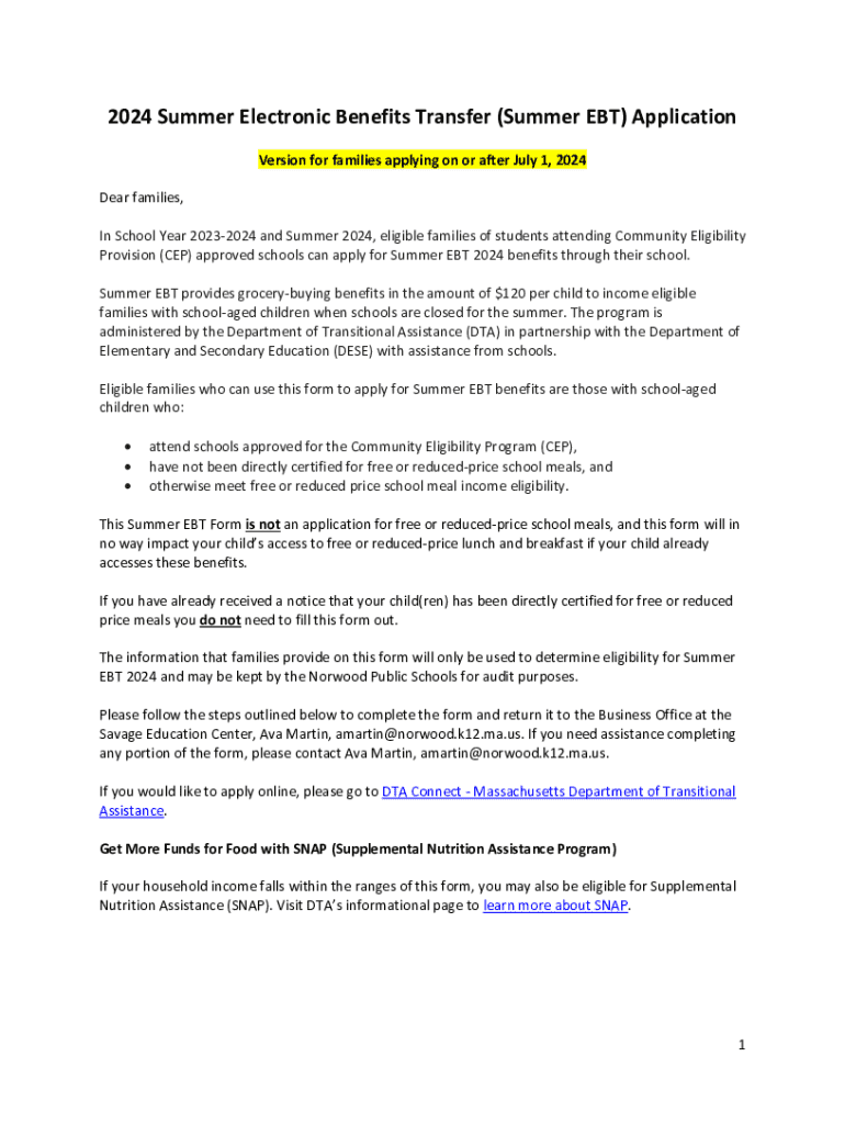2024 Summer Electronic Benefits Transfer (Summer EBT) Application Version for families applying on or after July 1, 2024 Dear families, In School Year 20232024 and Summer 2024, eligible families of