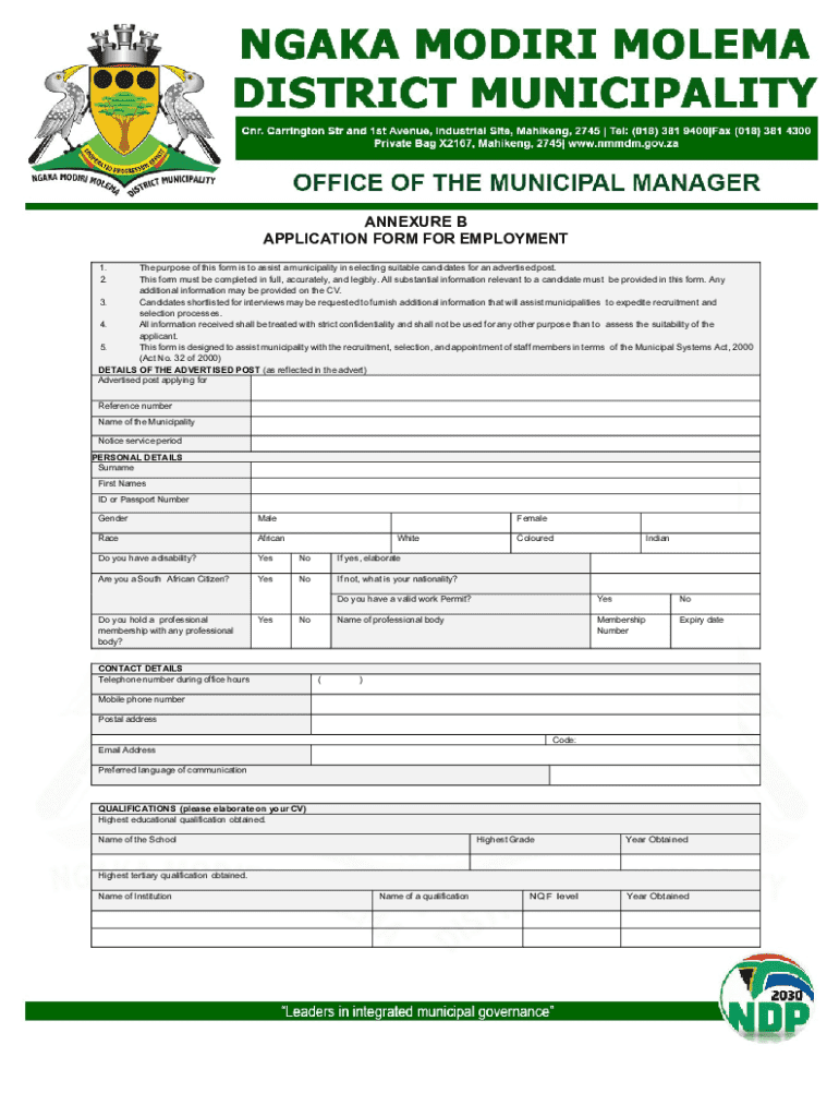 The South African Municipality Employment Application Form is an employment application document used by individuals applying for advertised posts within South African municipalities.