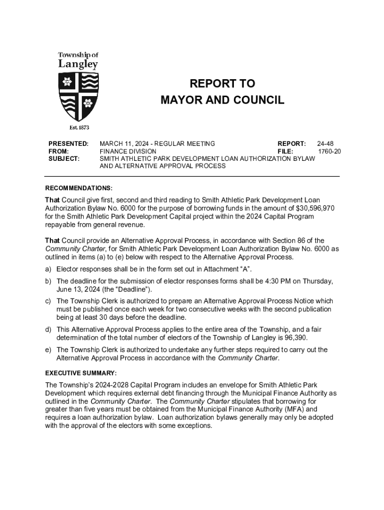 REPORT TO MAYOR AND COUNCILPRESENTED: FROM: SUBJECT:MARCH 11, 2024 REGULAR MEETING REPORT: 2448 FINANCE DIVISION FILE: 176020 SMITH ATHLETIC PARK DEVELOPMENT LOAN AUTHORIZATION BYLAW AND ALTERNATIVE