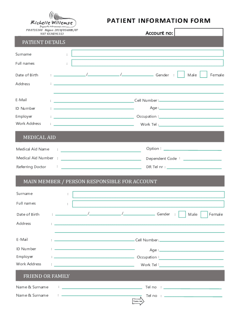 This document is a Patient Information Form incorporating details such as personal information, medical aid, main member details, and consent agreements. It also mentions the responsibilities of the patient regarding payments and consent for disclosing information. The form includes a medical questionnaire section for abdominal and pelvic patients with specific queries. The form outlines payment methods and office use codes for administrative purposes.