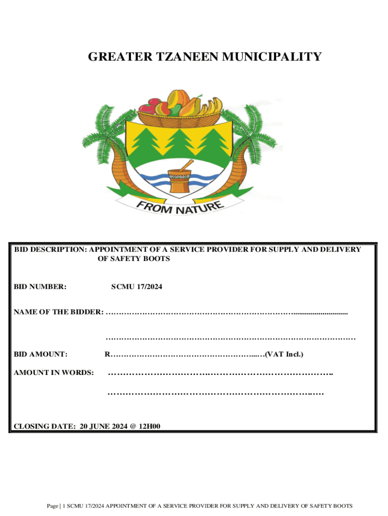 GREATER TAKEN MUNICIPALITY BID DESCRIPTION: APPOINTMENT OF A SERVICE PROVIDER FOR SUPPLY AND DELIVERY OF SAFETY BOOTS BID NUMBER:CMU 17/2024NAME OF THE BIDDER: ............................ BID AMOUNT: