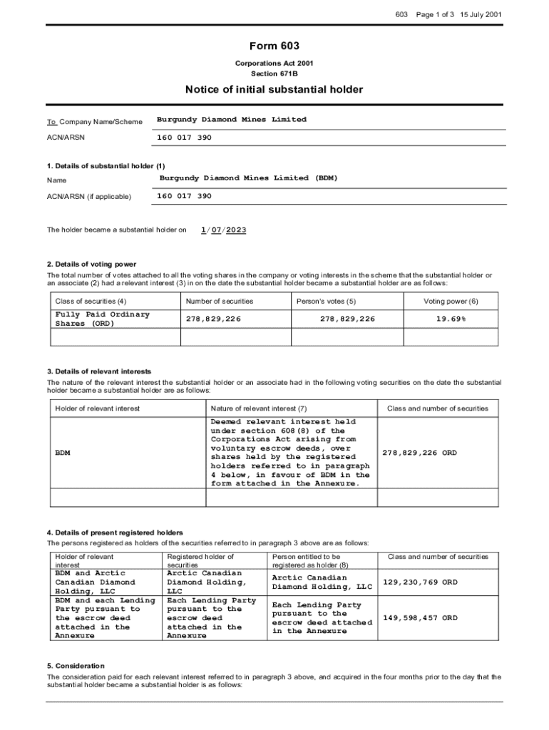 Form 603 under the corporations act is a notification of initial substantial holder, which must be lodged when a person's relevant interest in securities meets a certain threshold.