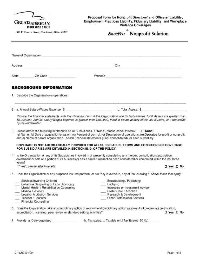 Proposal Form for Nonprofit Directors and Officers Liability,