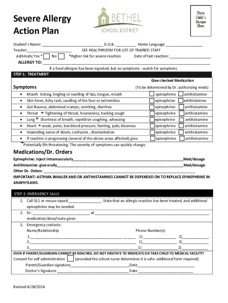 Severe Allergy Action Plan Students Name: ___ D.O.B. ___ Home Language ___ Teacher___ SEE BATHROOM FOR LIST OF TRAINED STAFF Asthmatic Yes * No *Higher risk for severe reaction Date of last reaction: