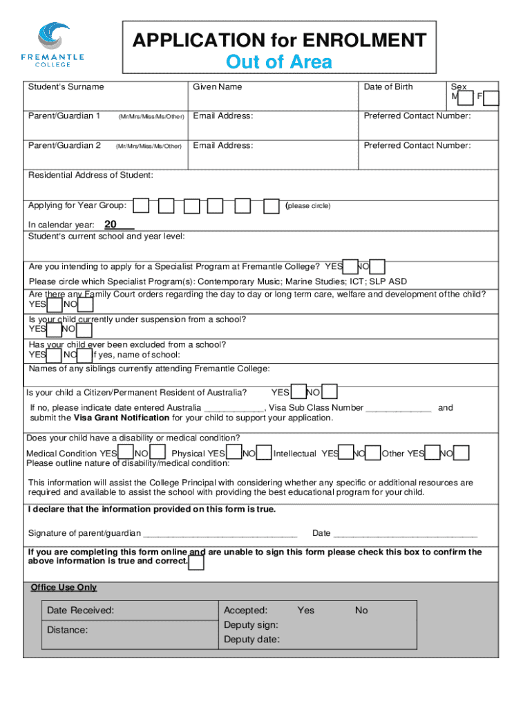 APPLICATION for ENROLMENT Out of Area Students SurnameParent/Guardian 1Parent/Guardian 2(Mr/Mrs/Miss/Ms/Other)(Mr/Mrs/Miss/Ms/Other)Given NameDate of BirthSex M/FEmail Address:Preferred Contact Number:Email