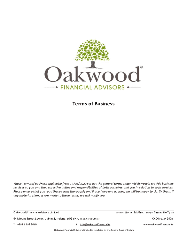 These Terms of Business applicable from 17/08/2022 set out the general terms under which we will provide business services to you and the respective duties and responsibilities of both ourselves and you in relation to such services.