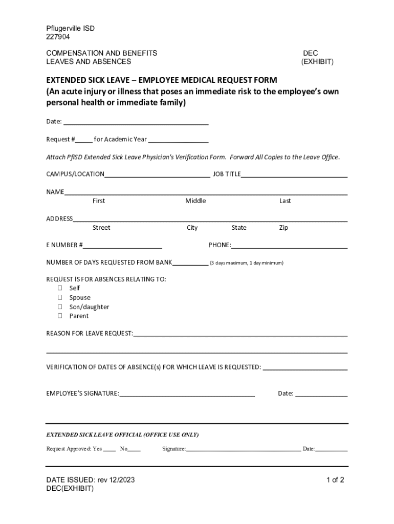 Pflugerville ISD 227904 COMPENSATION AND BENEFITS LEAVES AND ABSENCES DEC (EXHIBIT)EXTENDED SICK LEAVE EMPLOYEE MEDICAL REQUEST FORM (An acute injury or illness that poses an immediate risk to the