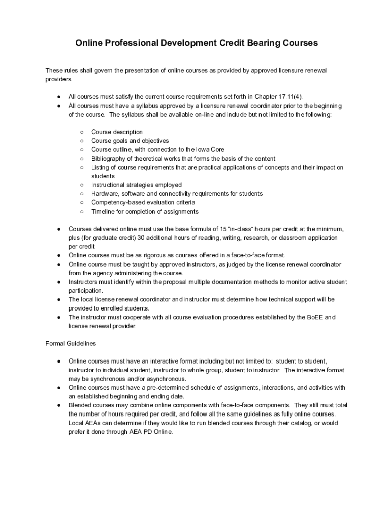 Online Professional Development Credit Bearing Courses These rules shall govern the presentation of online courses as provided by approved licensure renewal providers. All courses must satisfy the