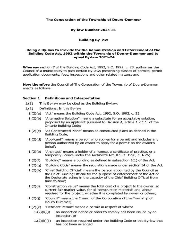 The Corporation of the Township of DouroDummer Bylaw Number 202431 Building Bylaw Being a Bylaw to Provide for the Administration and Enforcement of the Building Code Act, 1992 within the Township