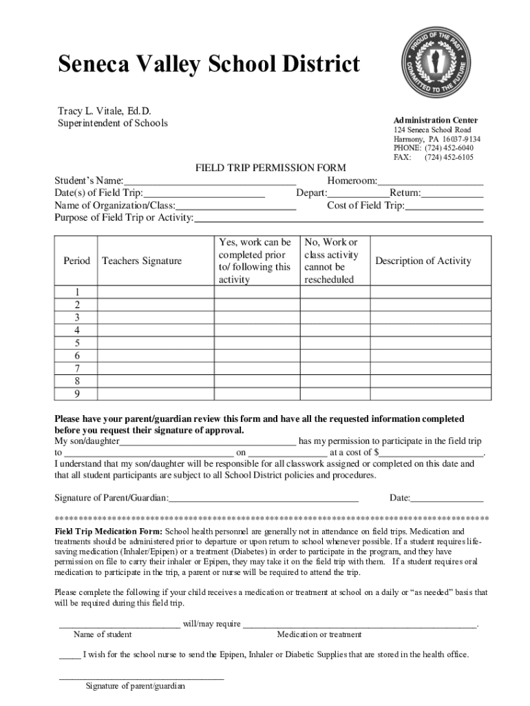 Seneca Valley School District Tracy L. Vital, Ed. D. Superintendent of SchoolsStudents Name: Date(s) of Field Trip: Name of Organization/Class: Purpose of Field Trip or Activity:PeriodTeachers Signature1