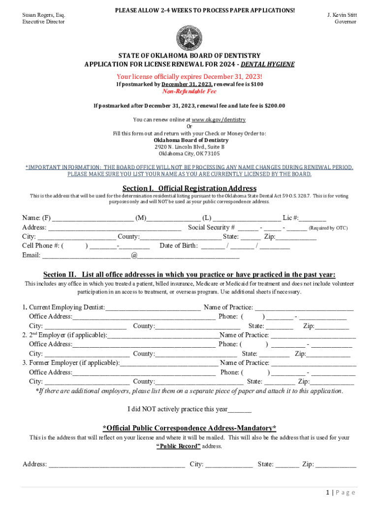 Susan Rogers, Esq. Executive DirectorPLEASE ALLOW 24 WEEKS TO PROCESS PAPER APPLICATIONS!J. Kevin Stitt GovernorSTATE OF OKLAHOMA BOARD OF DENTISTRY APPLICATION FOR LICENSE RENEWAL FOR 2024 DENTAL