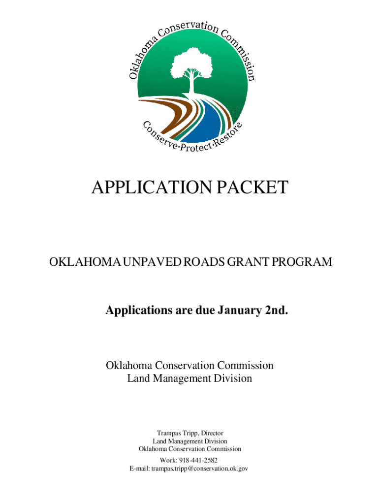 APPLICATION PACKETOKLAHOMA UNPAVED ROADS GRANT PROGRAM Applications are due January 2nd. Oklahoma Conservation Commission Land Management DivisionTrampas Trip, Director Land Management Division Oklahoma