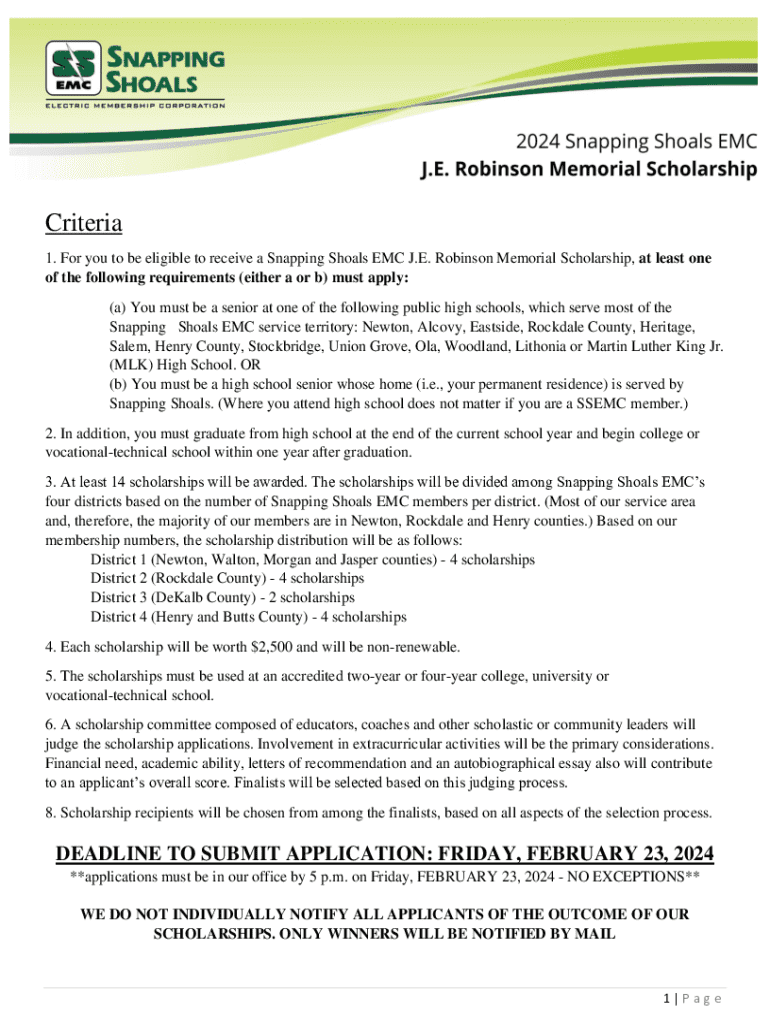 Criteria 1. For you to be eligible to receive a Snapping Shoals EMC J.E. Robinson Memorial Scholarship, at least one of the following requirements (either a or b) must apply: (a) You must be a senior