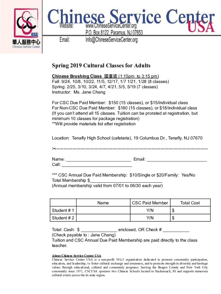 Spring 2019 Cultural Classes for Adults Chinese Brushing Class (1:15pm to 3:15 pm) Fall: 9/24, 10/8, 10/22, 11/5, 12/17, 1/7 1/21, 1/28 (8 classes) Spring: 2/25, 3/10, 3/24, 4/7, 4/21, 5/5, 5/19 (7