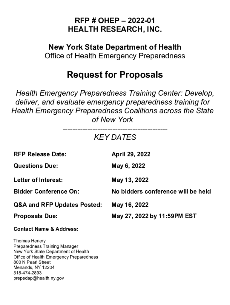RFP # HEP 202201 HEALTH RESEARCH, INC. New York State Department of Health Office of Health Emergency PreparednessRequest for Proposals Health Emergency Preparedness Training Center: Develop, deliver,